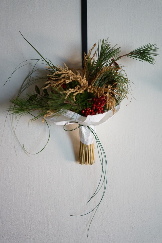 12月25日以降より順次発送予定でおります。 シンプルだけど華やかに、そして飾りやすさを重視してデザインしました、 壁やドアノブに掛けるなど気負わずお気軽にお正月のお迎えができます。 使用花材/松、藁、水引、サンキライ 大きさ/長さ約40cm 雨が当たらなければ屋外に飾って頂いても大丈夫です。
