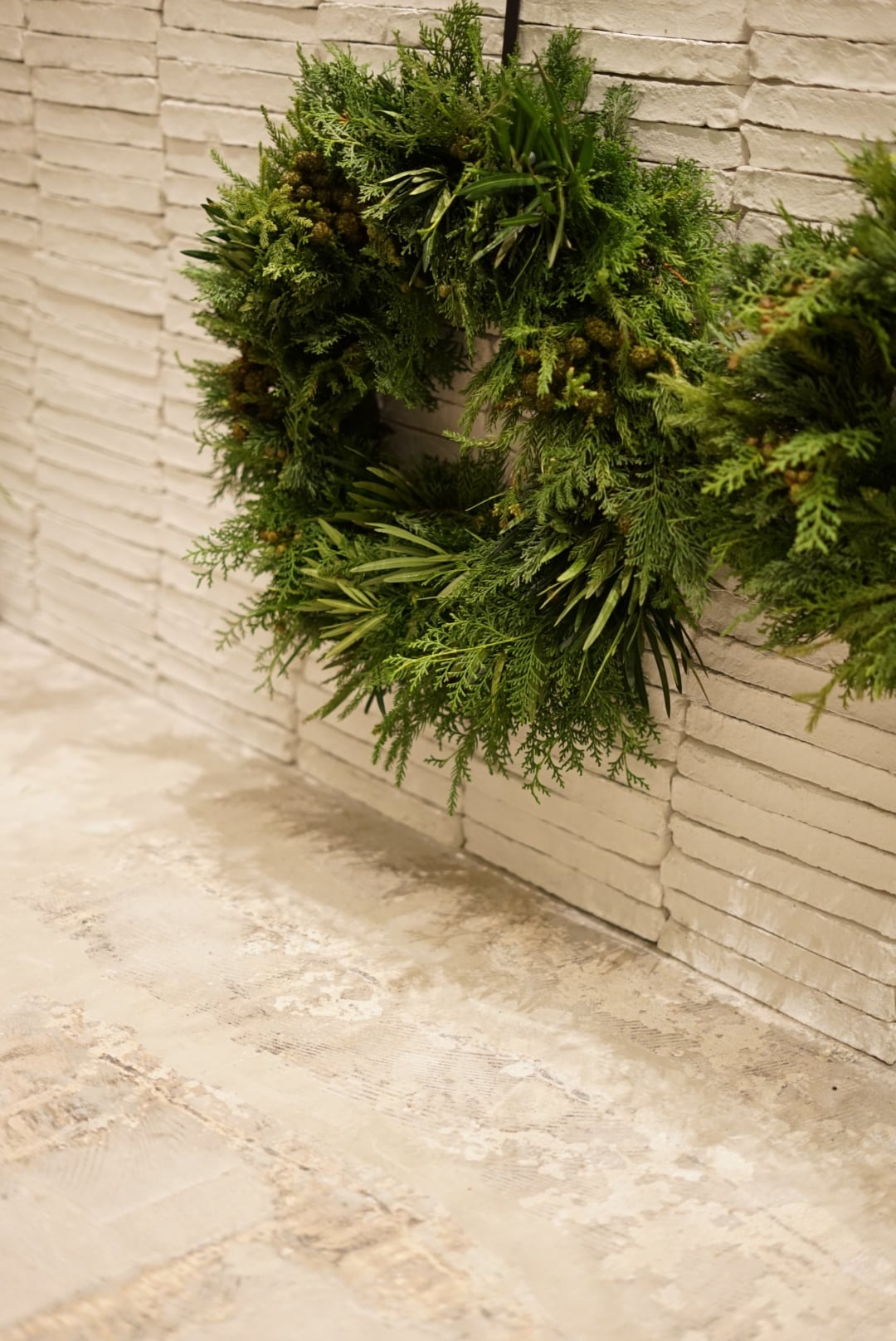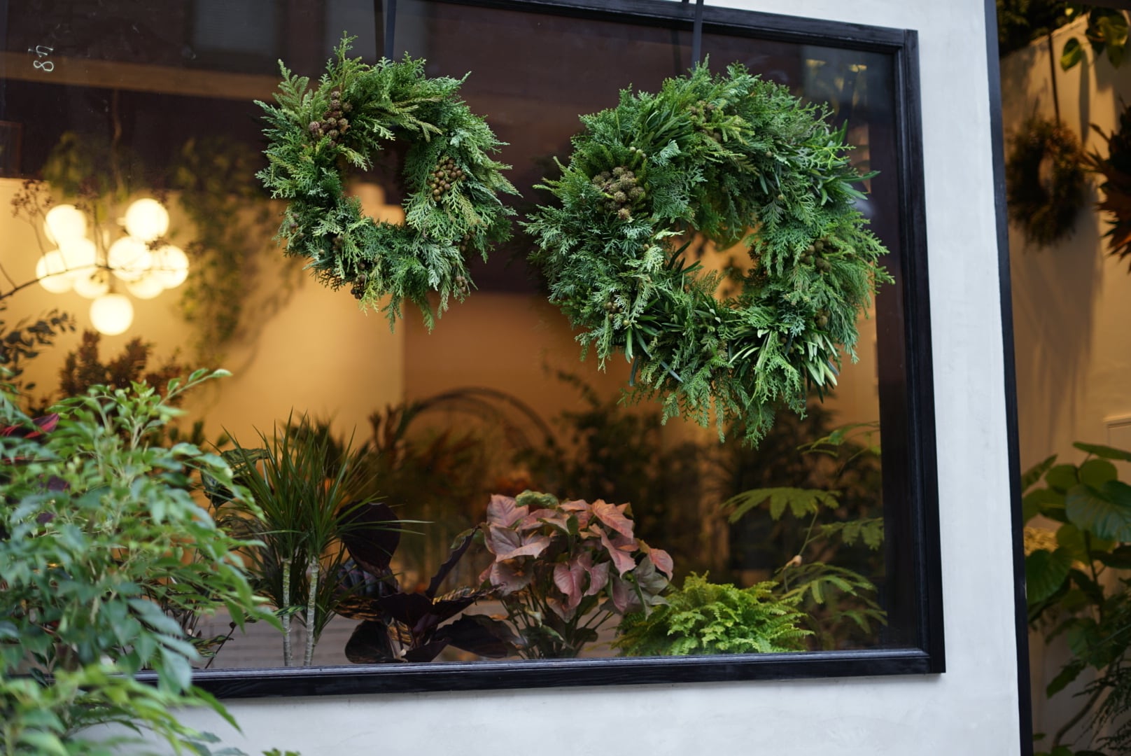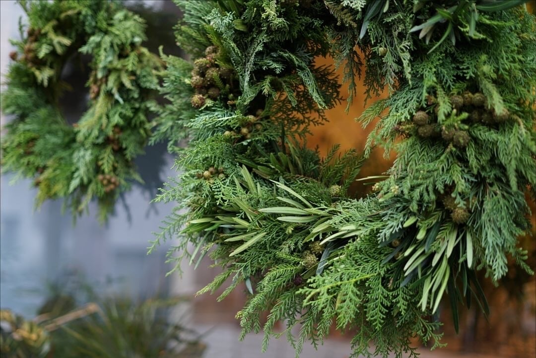 ホリデーシーズンへのワクワク感が高まるこの時期から飾り始め、グリーンの色合いは1〜2ヶ月続きドライへと変化していきます。