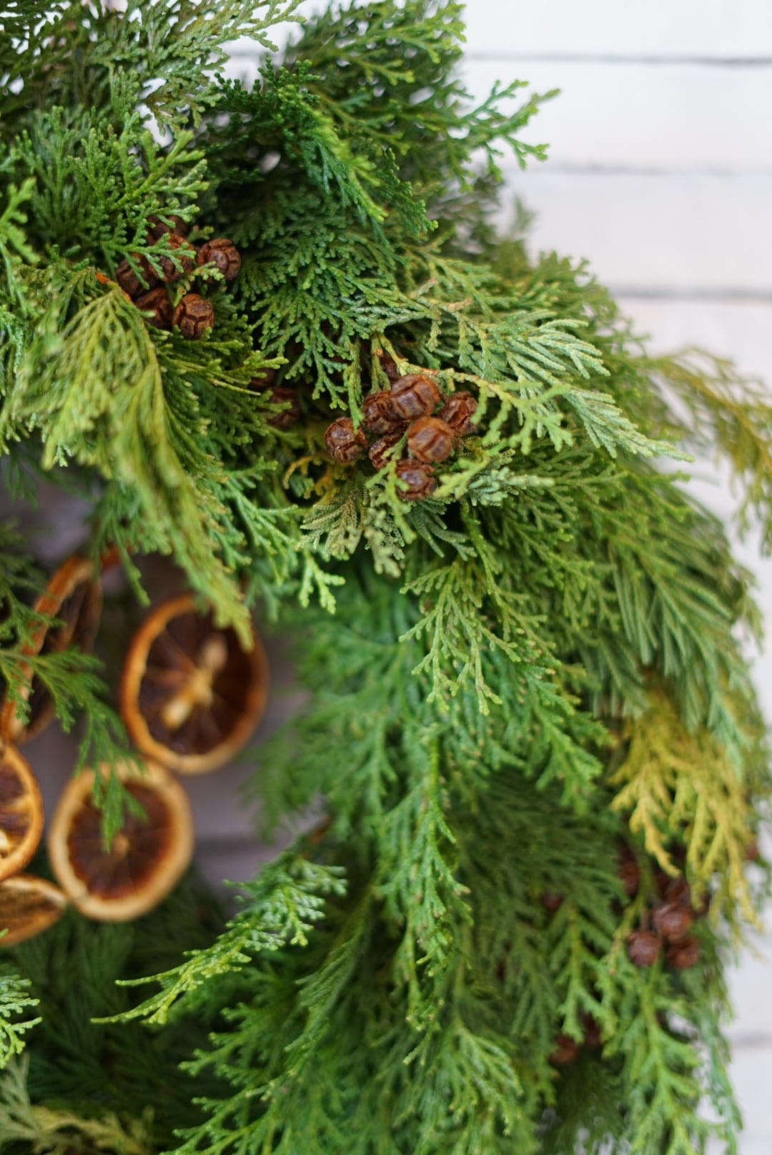 ホリデーシーズンへのワクワク感が高まるこの時期から飾り始め、グリーンの色合いは1〜2ヶ月続きドライへと変化していきます。