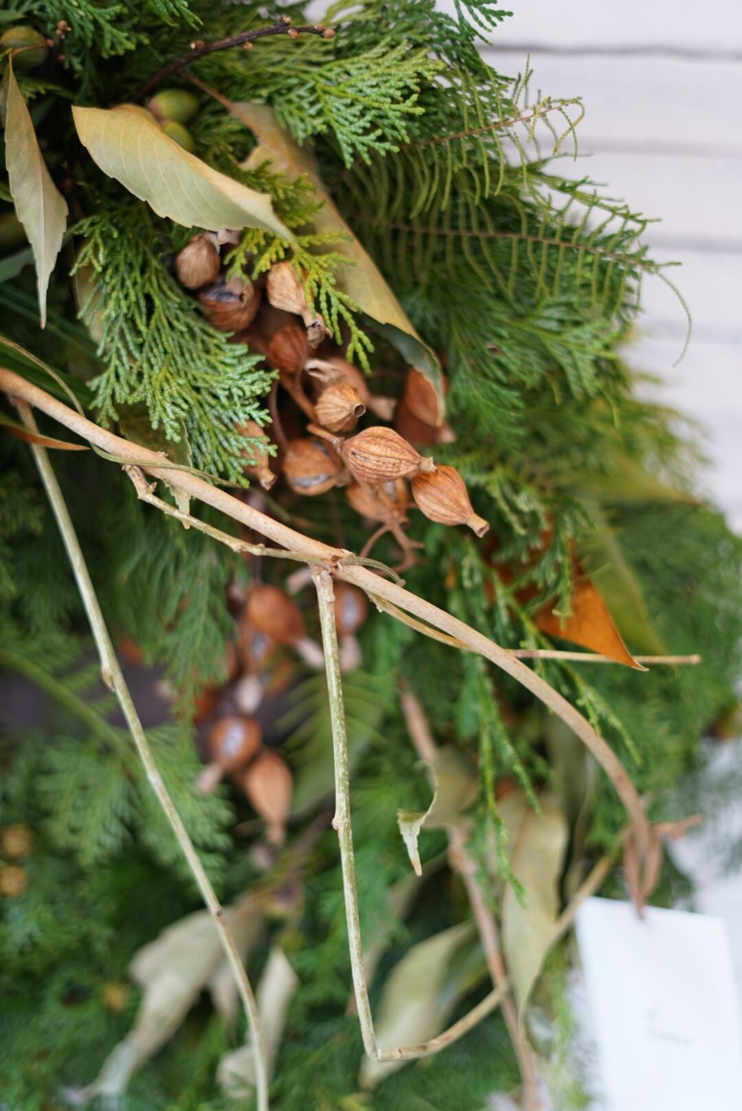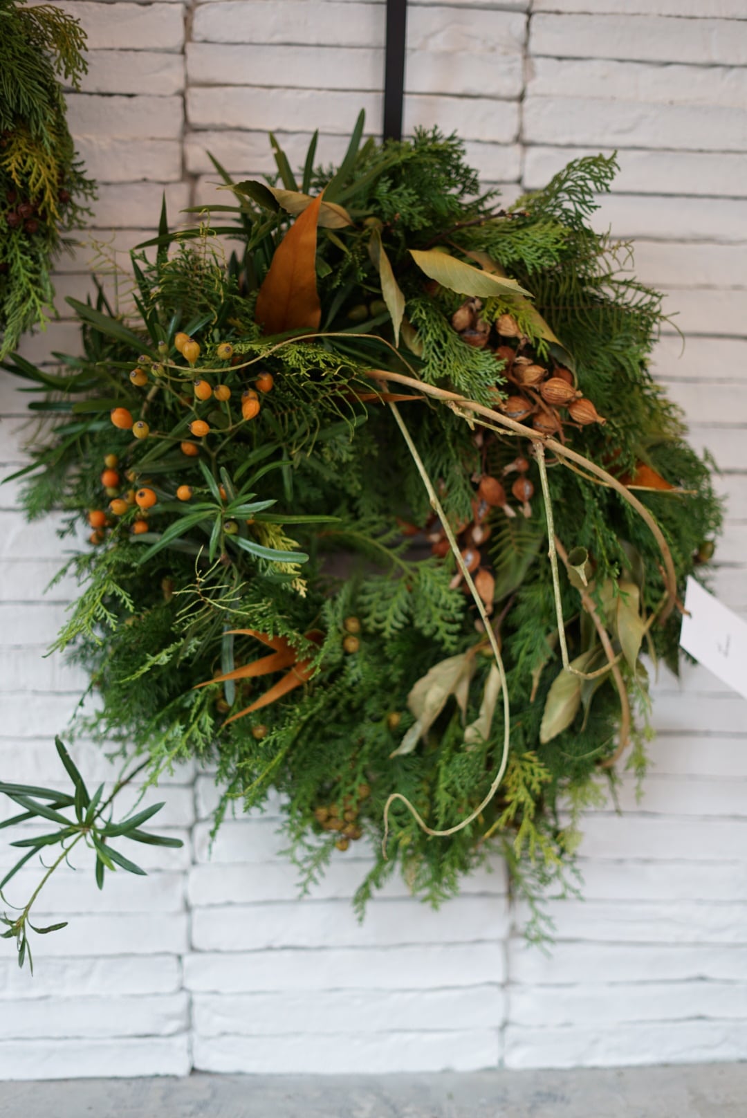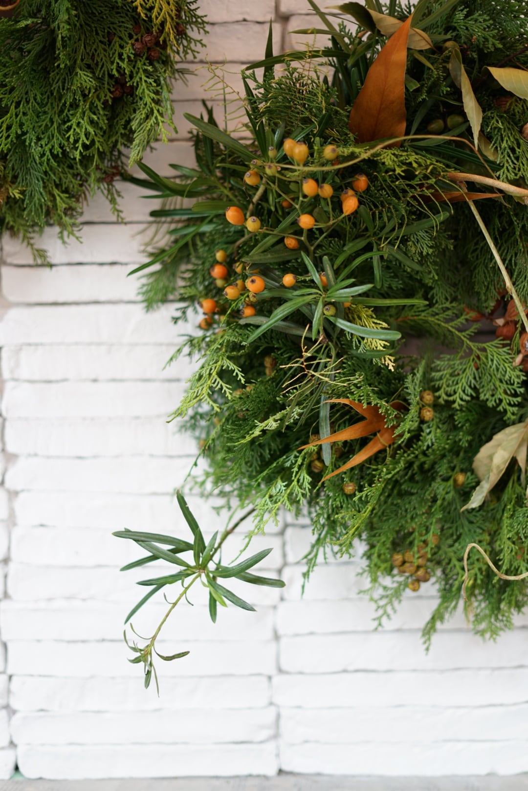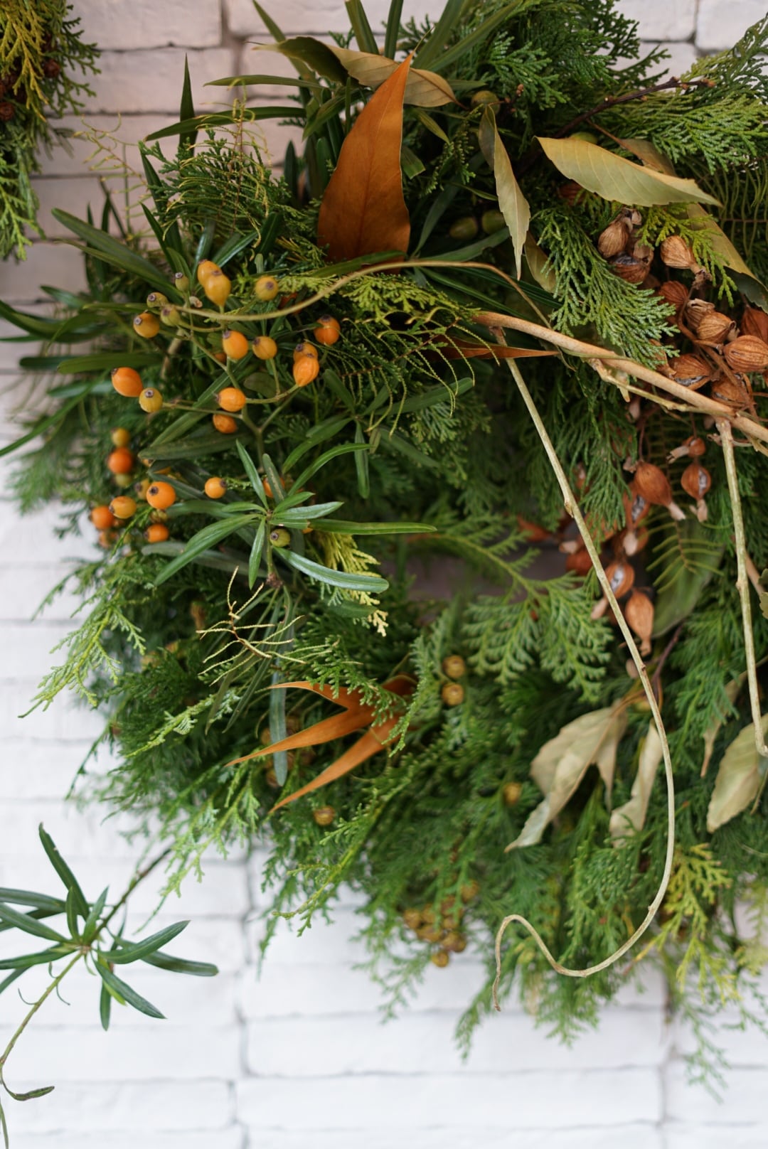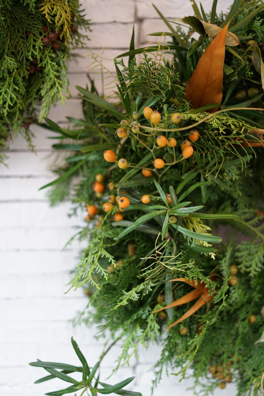 ホリデーシーズンへのワクワク感が高まるこの時期から飾り始め、グリーンの色合いは1〜2ヶ月続きドライへと変化していきます。