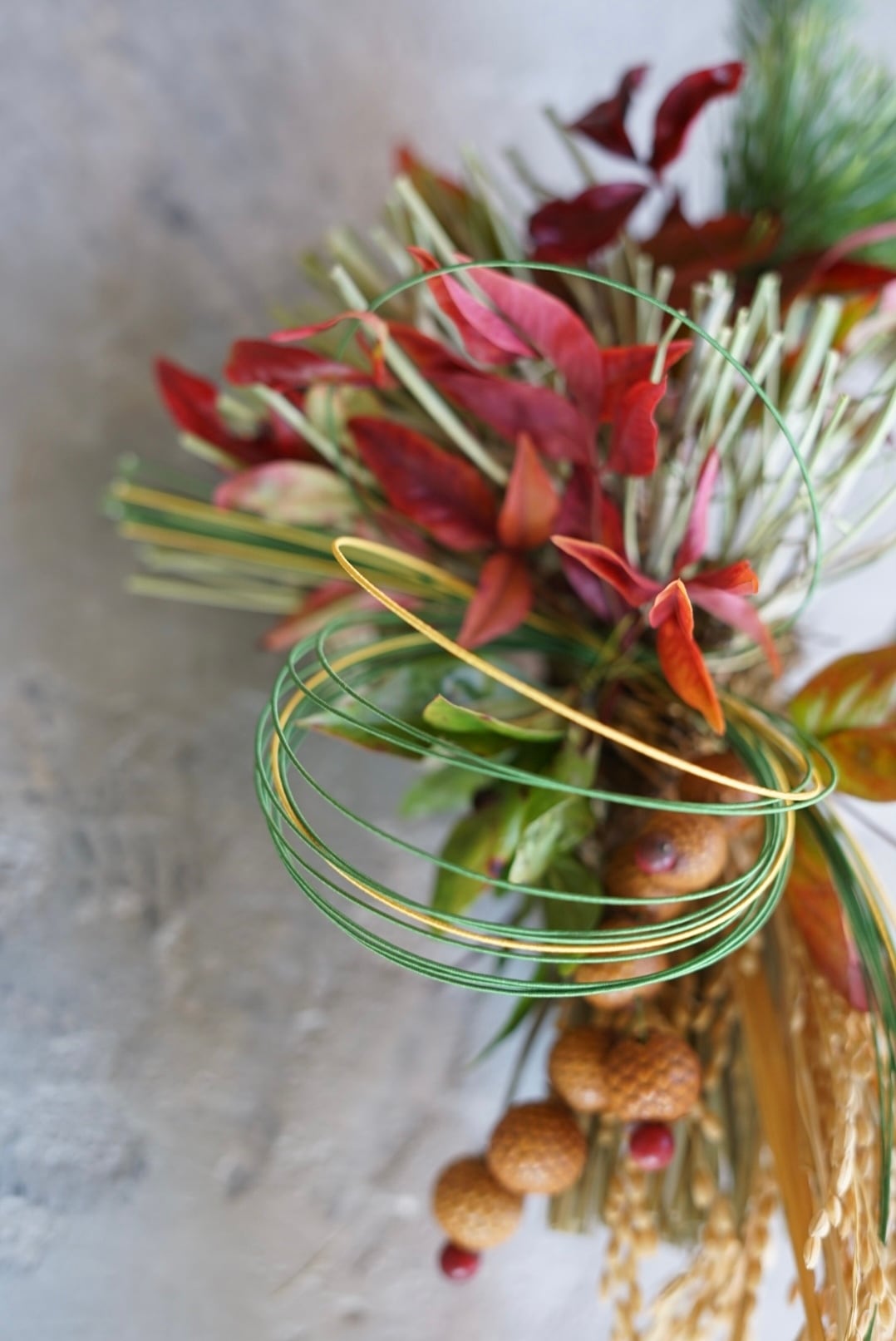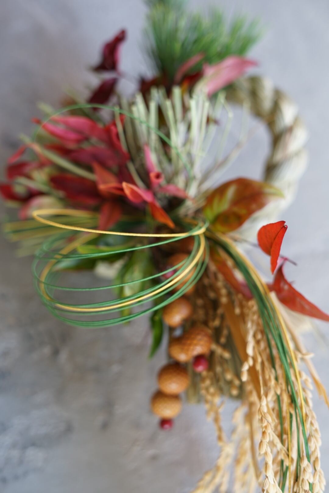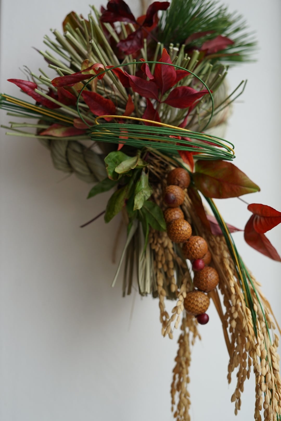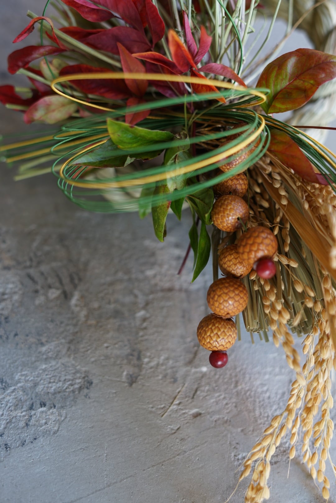 そんな願いを込めてドライになった根っこがなんともかわいいニゲラの根っこに松、稲穂、紅葉した南天の葉と椰子の実を合わせました。