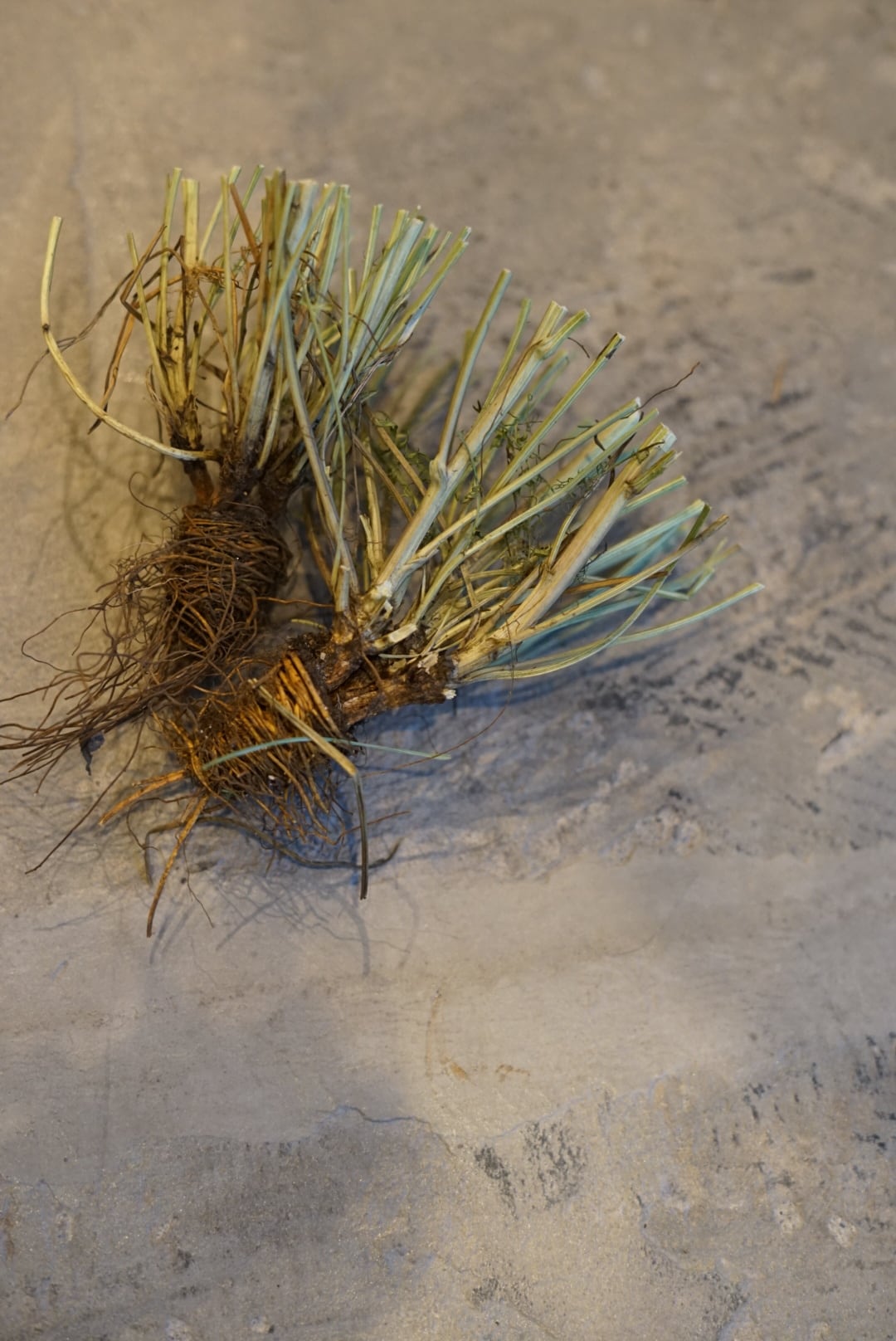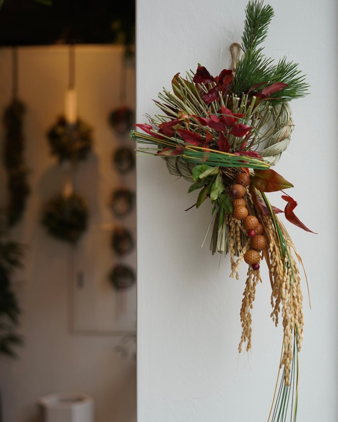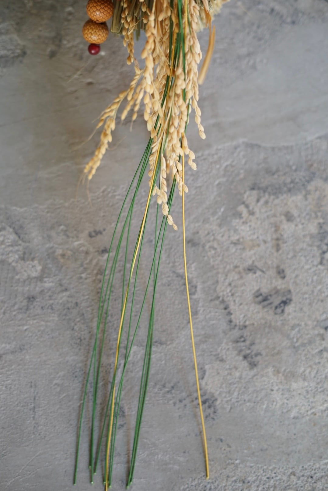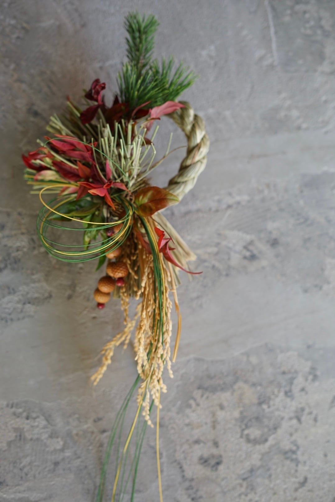 そんな願いを込めてドライになった根っこがなんともかわいいニゲラの根っこに松、稲穂、紅葉した南天の葉と椰子の実を合わせました。