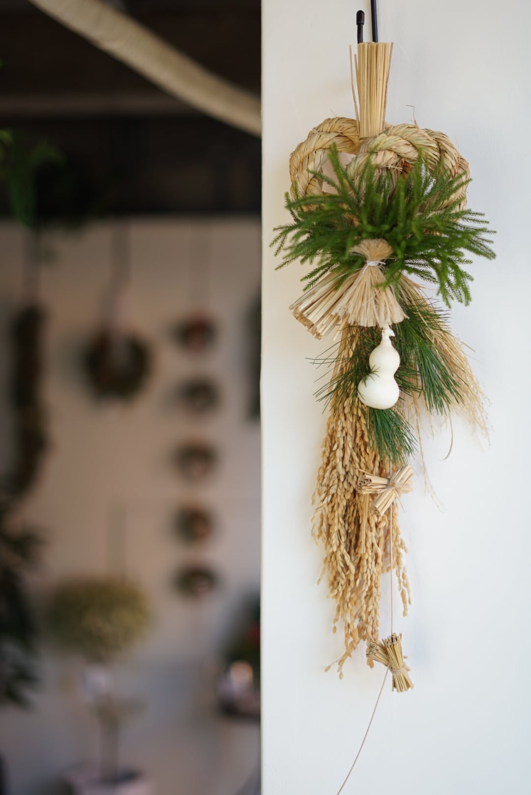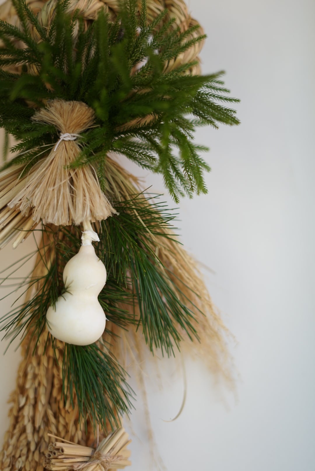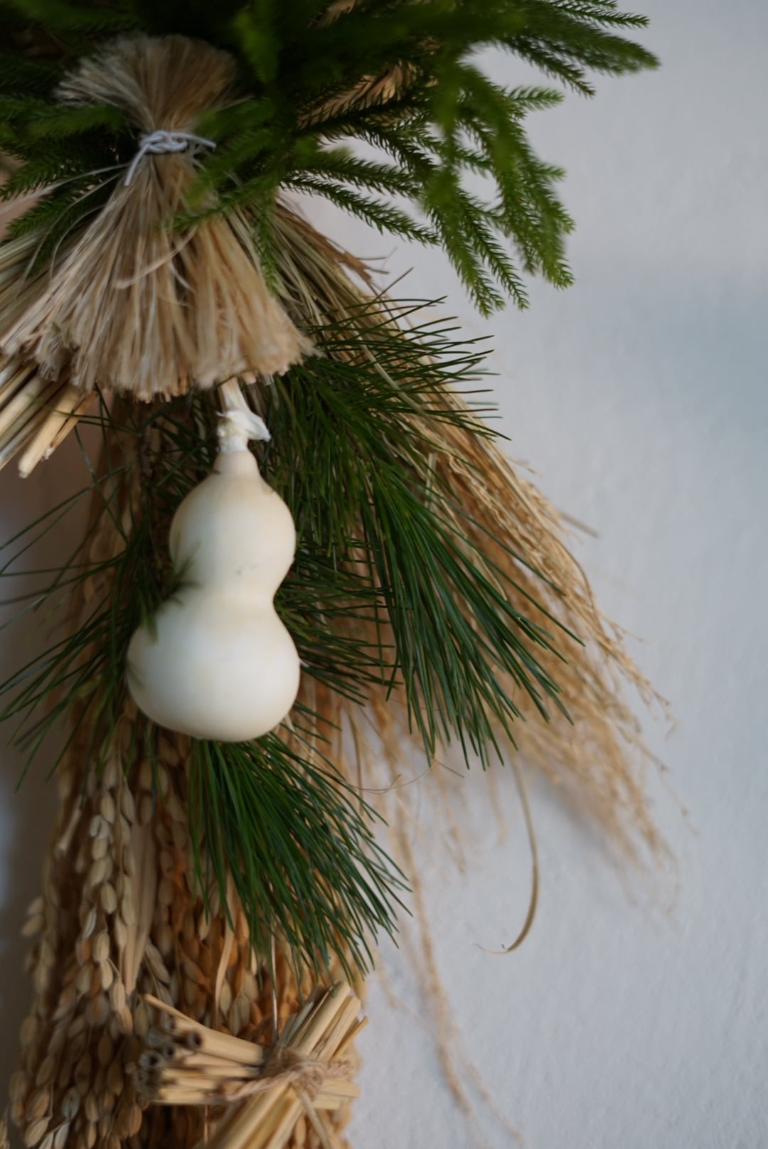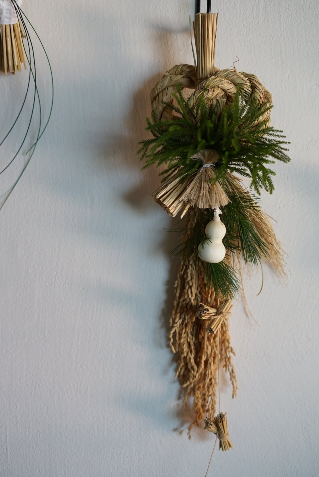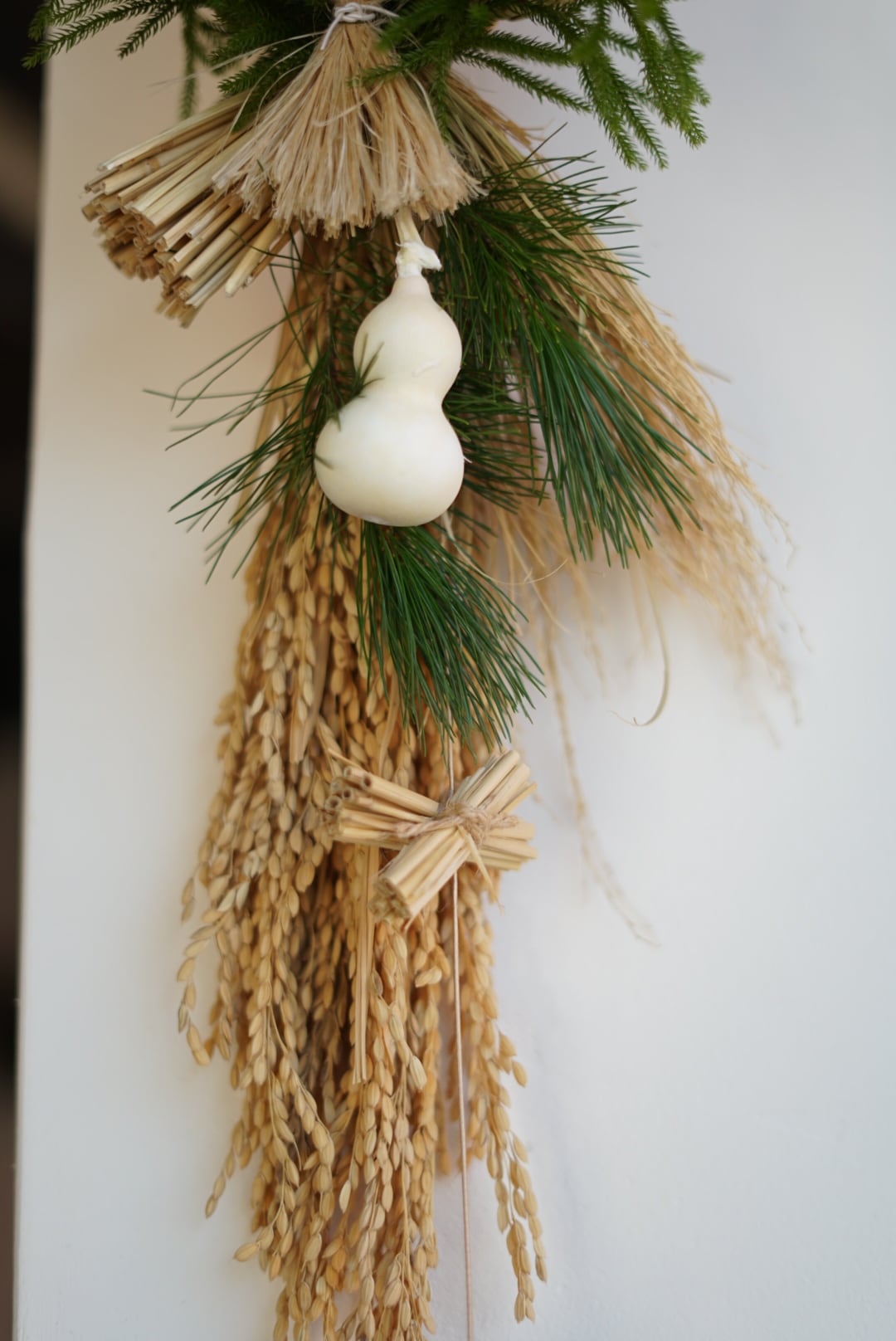 丁寧に作られたしめ縄に稲穂、松、日陰葛と白いひょうたんを合わせました